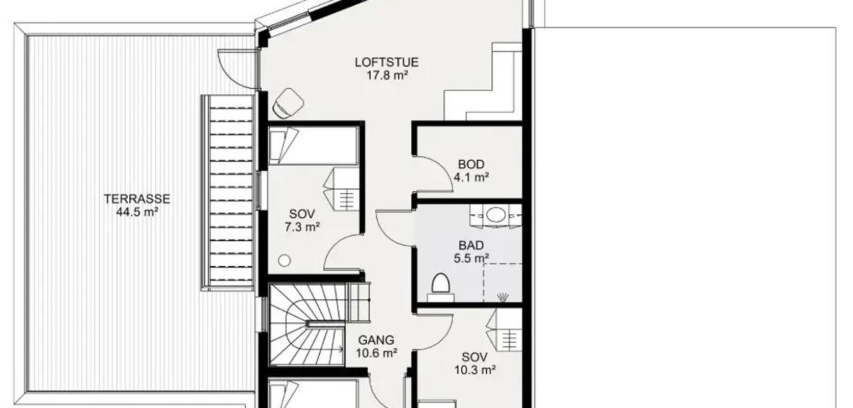 En trapp fra hallen fører deg til husets loftsetasje, hvor du finner tre ekstra soverom, et bad, en praktisk bod og en spennende loftstue. Denne har en unik skråvegg som skaper et karakteristisk overheng over uteplassen på grunnplanet. Store panoramavinduer, som går fra gulv til tak, gir deg en imponerende utsikt og gjør loftstuen til et unikt samlingssted. Signatur 307 er det ideelle huset for deg som ønsker noe litt annerledes og moderne.